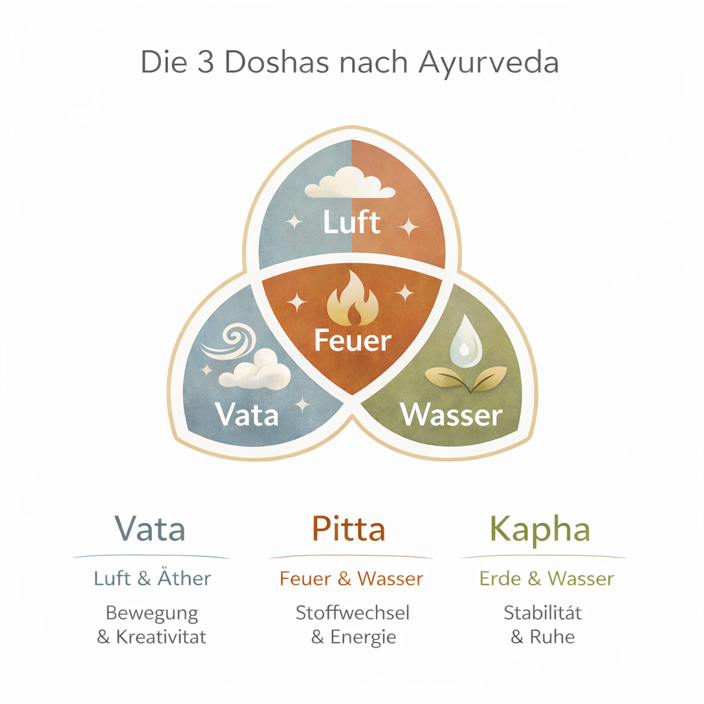 Die drei Dosha-Typen sind Vata (Luft), Pitta (Feuer und Wasser)